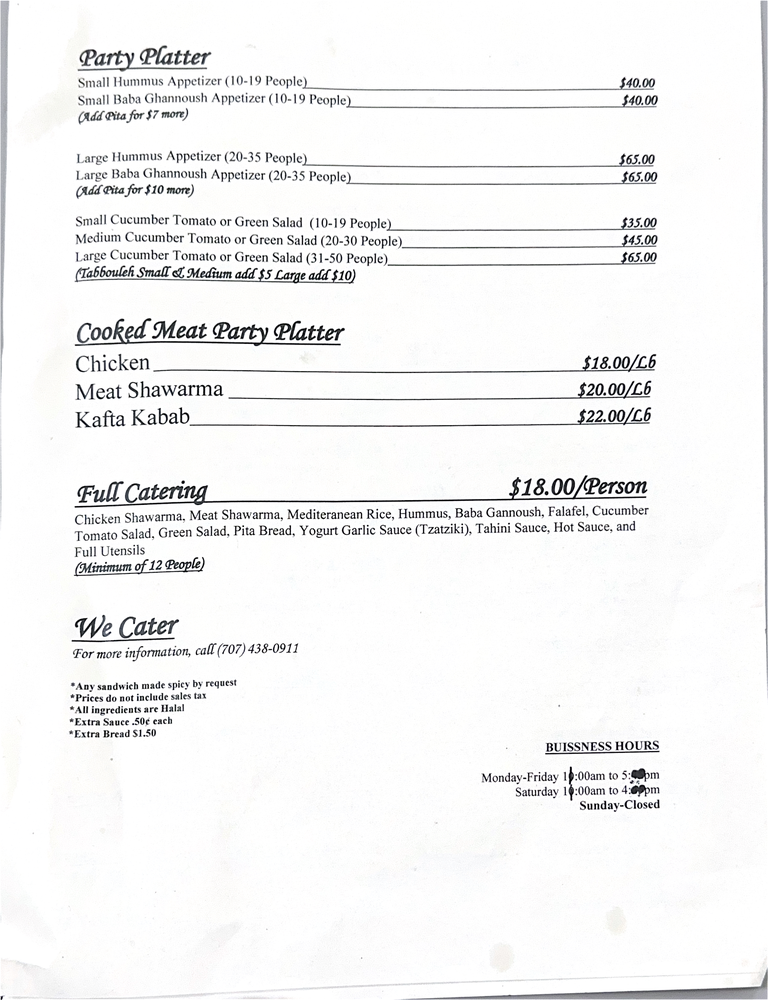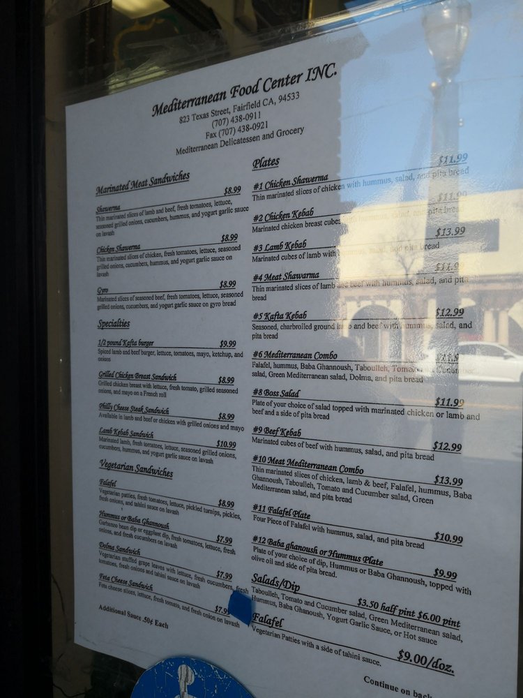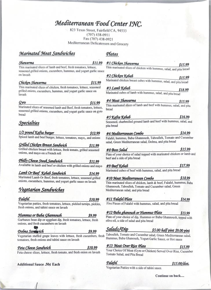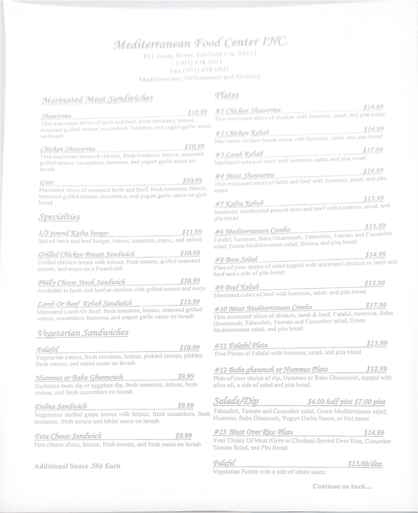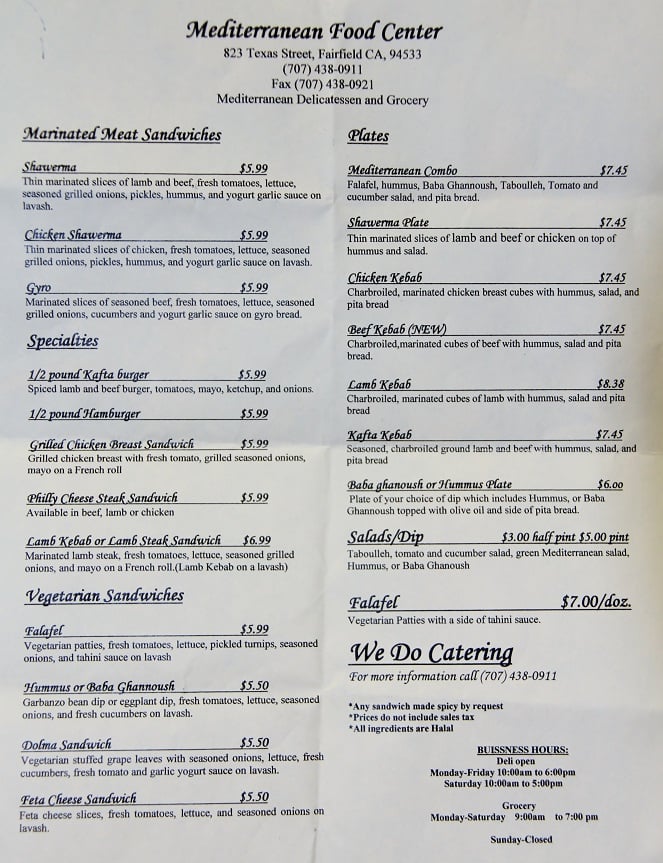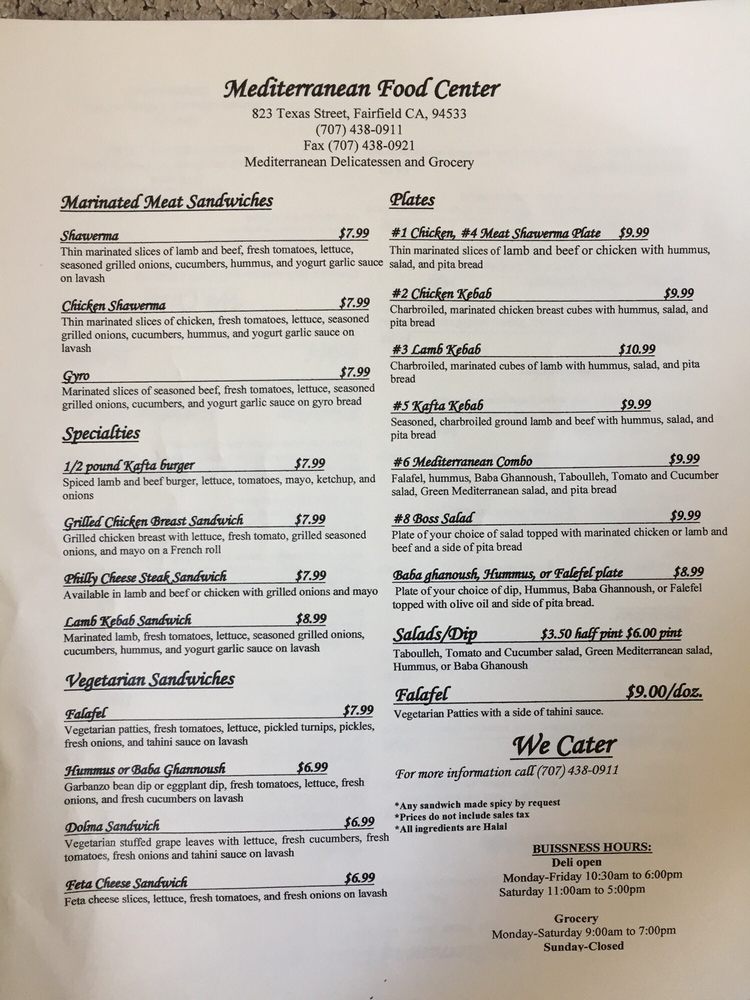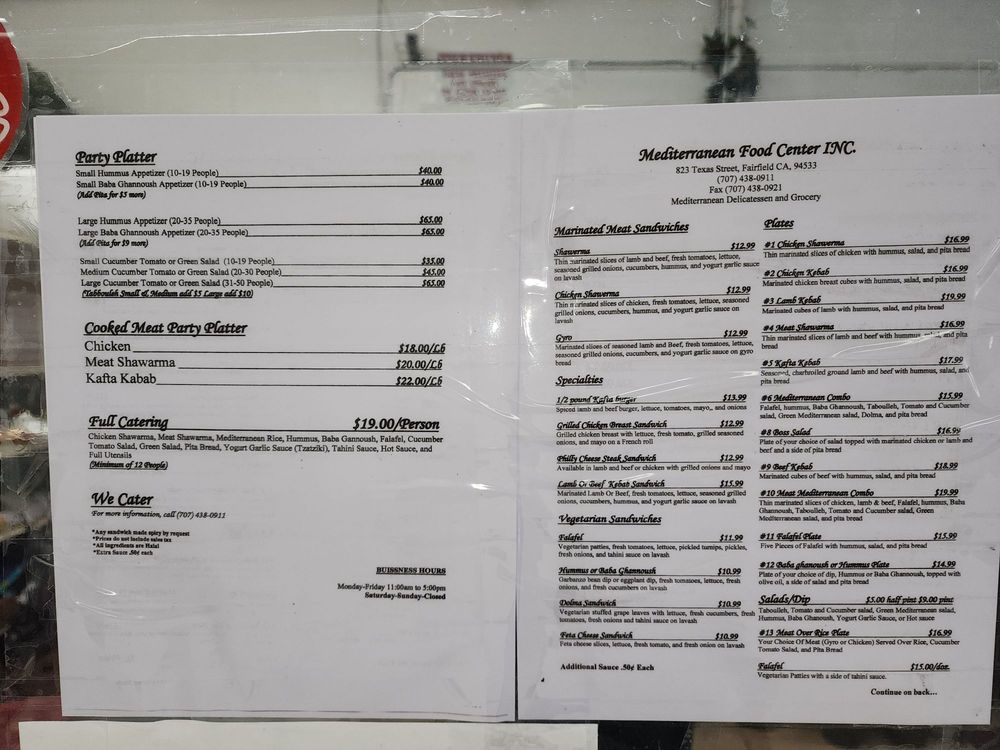 Introducing the menu at Mediterranean Food Center! Located in Fairfield, CA, this restaurant offers a wide range of Mediterranean dishes with options like lamb and beef plates, falafel veggie plates, baba ganoush, hummus, and gyro. Customers rave about the generous portions, flavorful meats, and authentic taste. The cozy atmosphere and friendly service make it a favorite spot for lunch or dinner. The must-try items include the chicken shawarma, lamb and beef shawarma plate, and the hummus with naan/pita bread. Whether dining in or getting takeout, Mediterranean Food Center promises a delicious and satisfying meal experience that will leave you wanting more. Don't miss out on their famous baklava for a sweet ending to your meal!